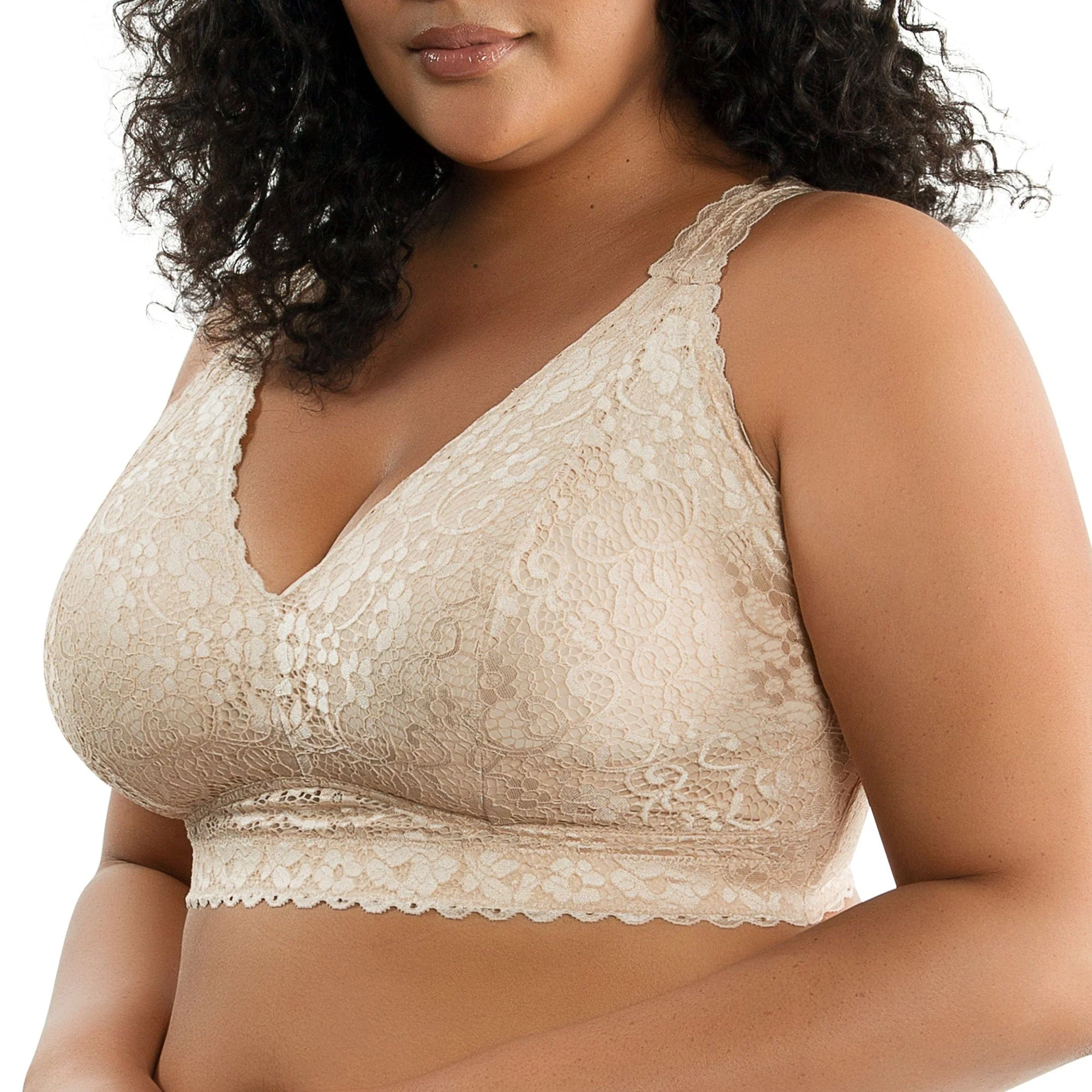 Pretty and lacy, this wire-free bralette is very supportive and super comfortable. The convertible J-hook feature allows for a racerback option. Specially designed for full busted and full figure women. Inclusive sizing and a wide variety of colors available.